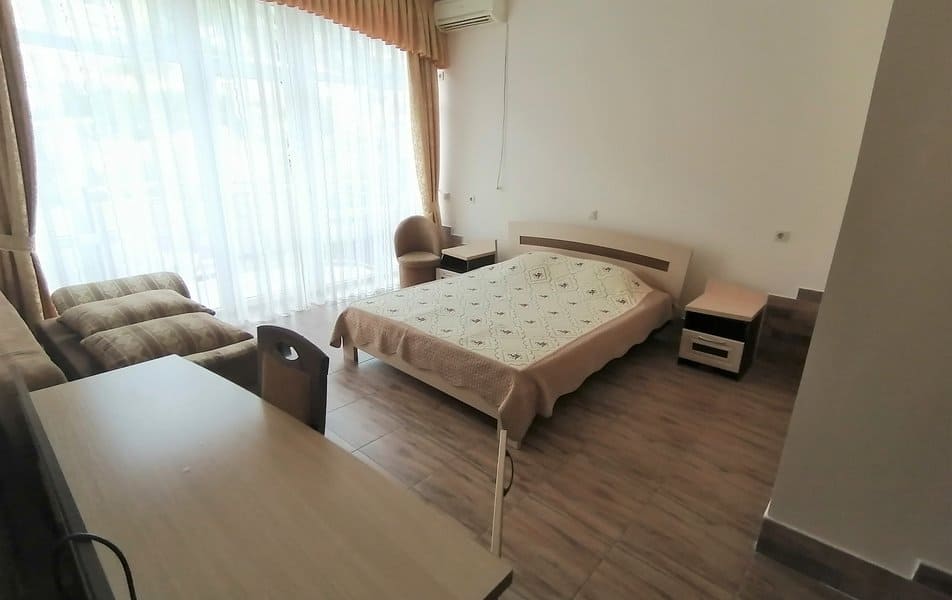 Пляж:  150 метров. Оборудован шезлонгами и зонтами. На берегу – мелкая галька.