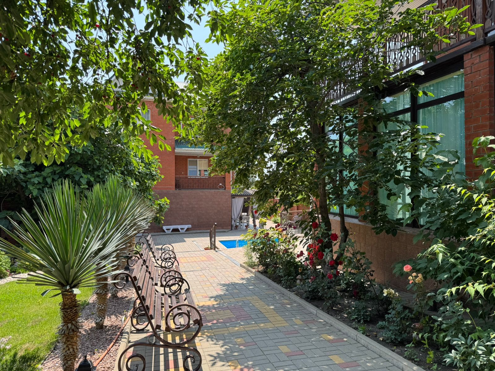 Есть места для отдыха в холле и во дворе. Во дворе бассейн с шезлонгами и душем, места для отдыха на лавочках в теньке.